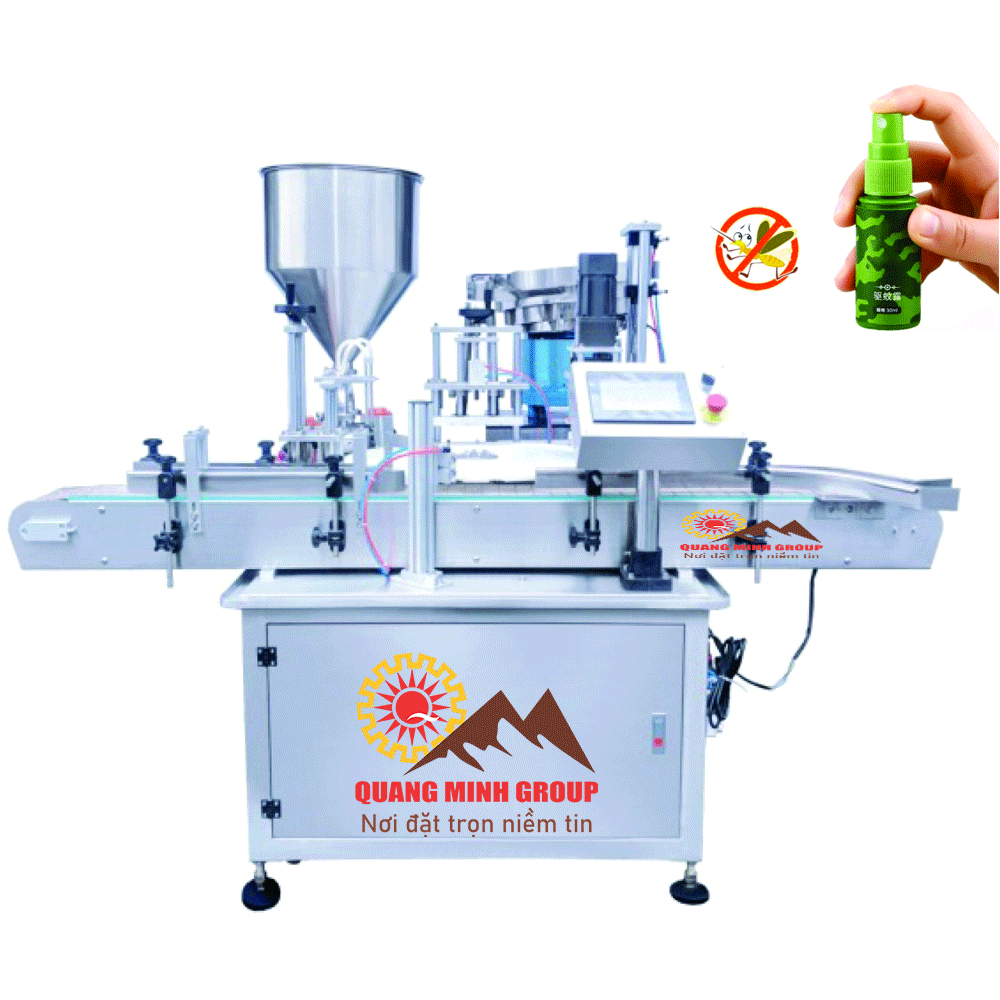 Máy chiết rót và siết nắp chai xịt 3 in 1 tự động dạng xoay QM-CRSN-01